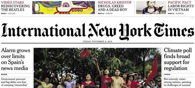 La situación de los medios españoles ha merecido un informe crítico en las páginas de The New York Times. La Ley mordaza, la situación de la radiotelevisión pública y la dependencia de la prensa pretendidamente independiente respecto de los poderes económicos (sobre todo, los financieros) forman parte del panorama descrito por el periódico norteamericano. Los editores españoles han reaccionado arrejuntados, en santa compaña, frente a la patraña alentada por periódico estadounidense, que aún conserva el crédito de una cierta pátina de autonomía frente al sistema al que sirve.